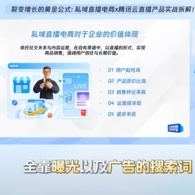 通过企业的自有渠道触达用户的数字化的场域,优质的内容、服务产品,基于信任关系形成的可以随时触达的流量池,我们称为它是私域。私域直播对于企业的价值体现大概包括6个方面。依托社交的私域,内容运营,强调了用户的信任和长期价值。它在私域中对于用户的粘性非常高。C端用户的最初的沉淀可能就与企业本身的销售行为有关。那第二就是产品的最价比高。在公域平台上大的流量,始终去做流量的曝光。那在私域中,对于企业自发的私域直播行为,我们可以提高产品的性价比,包括质量与价格的双线提高。第三就是销售转化效率非常高。传统我们在公寓上给到我们的客户去做触达,全靠曝光以及广告的搜索词。但是在私域直播中,它是一个长期的可以反复触达的,强调用户信任的环境。第四,关于运营成本上,那本身在企业来说,面向于所有的私域流量,参口的触达并不需要我们有很强的广告营销或者是品牌SU的能力。那更多的是我们企业内对于私域用户的整个链路的SOP的设计,给到我们的销售的人员如何去进行触达已有的私域粉丝。第五的话就是基于强信任品牌价值的加持。同时,在直播间内能够影响到客户对于消费的心智,以及对于客户做产品的价值输出、消费教育、价值传递。